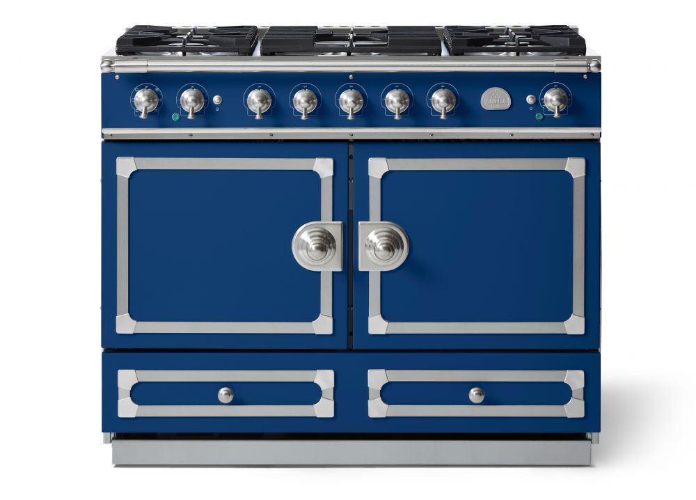 Double oven dual fuel italian range with true convection 5 burners griddle chrome trim in blue 4 299 00.